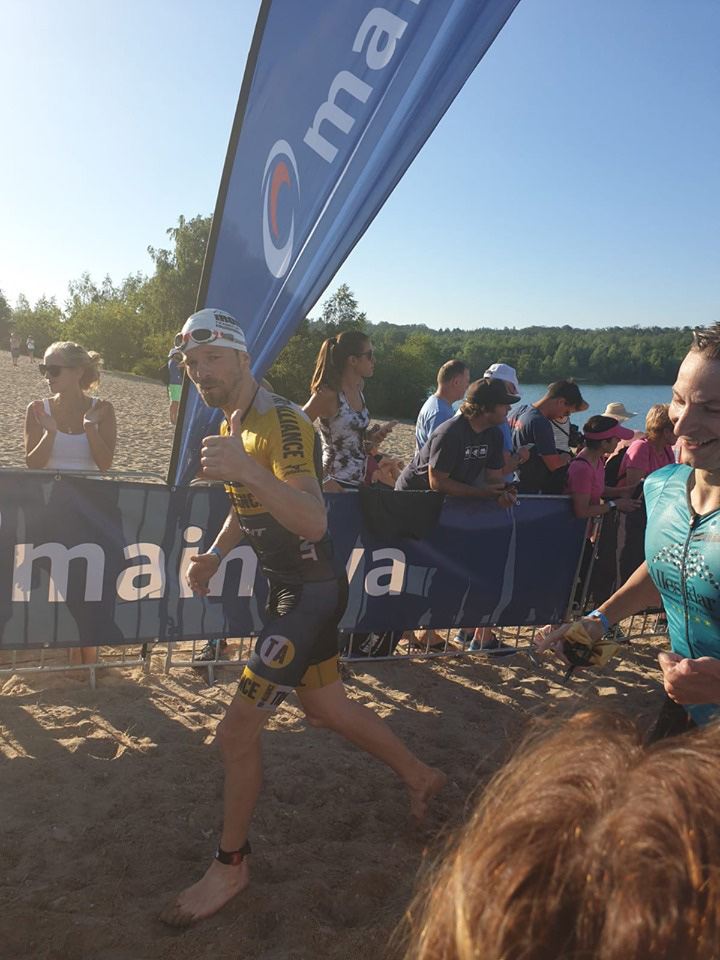 Nice balmy water and rolling start got me off to a relaxed swim until the first turning buoy @750m where I sank about €400 of Garmin Fenix (which wasn’t protected by a wetsuit…) in Langener See. On the ways back I had major issues with the sun glare and lost a couple of minutes at least, trying to find first the Aussie exit and later the final the swim exit…
